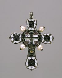 | Keywords: Russian - Pendant Cross - Walters 44503.jpg This cross depicts at its center a second small cross of the Crucifixion flanked by miniature representations of the lance and sponge instruments of Christ's Passion The skull below suggests the name of the hill - Golgotha place of skulls - and also refers to the legend that Christ was crucified on the site of Adam's tomb The Church Slavonic abbreviations on the cross arms stand for King of Glory top The Place of the Skull Became Paradise bottom Jesus Christ left and right Lance left and Sponge right ca 1700 Early Modern silver champlevé enamel pearls H 2 1/2 x W 1 13/16 x 1/4 in 6 3 x 4 6 x 0 68 cm accession number 44 503 39848 Henry Walters Baltimore by purchase Walters Art Museum Henry Walters Acquired by Henry Walters A Millennium of Christianity Russian Art from The Walters Art Gallery The Walters Art Gallery Baltimore 1988-1989 Russian Enamels The Walters Art Gallery Baltimore 1996-1997 place of origin Velikii Ustiug Russia Walters Art Museum license Russian art in the Walters Art Museum Pectoral crosses from Russia Media contributed by the Walters Art Museum needs category review 1700s jewellery |