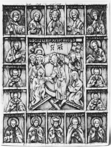 | Keywords: Russian - Resurrection of Christ - Walters 71260.jpg The center of this plaque shows the Anastasis Resurrection with Christ standing on the broken gates of hell and pulling Adam up from below as a sign that the Original Sin has been redeemed A kneeling Eve and other Old Testament figures wait to be saved Above Christ is shown as lord of the universe flanked by the Virgin Saint John the Baptist and the archangels Michael and Gabriel who pray to him for the salvation of humankind Below from left to right are the apostles Peter and Paul Saints Nicholas and Gregory the Theologian wrongly named John the Theologian in the accompanying inscription Dionysius the Areopagite and Alexis Metropolitan of Moscow Stephen George Catherine Sergius of Radonezh and Xenia The back of the plaque carries an image of the instruments of Christ's passion the Cross Crown of Thorns Lance and Reed with vinegar-soaked sponge century 16 17 Early Modern ivory cm 7 8 5 9 0 6 accession number 71 260 10633 Henry Walters Baltimore date of acquisition unknown by purchase Walters Art Museum Henry Walters Acquired by Henry Walters Translation on the back The King of Glory Jesus Christ conquers The Place of a Skull became Paradise A Millennium of Christianity Russian Art from The Walters Art Gallery The Walters Art Gallery Baltimore 1988-1989 place of origin central Russia Walters Art Museum license Russian art in the Walters Art Museum Religious art in Russia Art of the Russian Orthodox Church Media contributed by the Walters Art Museum needs category review |