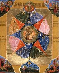 | Keywords: Russian - Virgin of the Burning Bush - Walters 372478A.jpg This is a late example very conservative in painting style of a type of image that was first developed in Russia in the late 16th century It is primarily based on the Old Testament story in which God revealed himself to Moses in a bush that burned without being consumed by the fire The Burning Bush was used as a metaphor for the Virgin Mary who gave birth to a child while retaining her virginity The Virgin and Christ Child in the center of the panel are surrounded by the symbols of the four evangelists and by angels whom Mary as the Queen of Heaven commands These angels as the accompanying inscriptions explain hold sway over various natural elements wind fire ice darkness etc cf Hebrews 1 7 Four Old Testament scenes in the corners prophetically refer to the Incarnation Moses before the burning bush Exodus 3 2 Isaiah's vision of a cherub holding a coal with tongs Isaiah 6 6 Ezekiel's vision of a shut door through which the Lord alone can enter Ezekiel 44 2 and Jacob's dream of a ladder leading to heaven Genesis 28 12-13 In the frame below is the Virgin's ancestor Jesse father of King David century 19 Modern tempera gold wood cm 36 31 3 8 accession number 37 2478A 6972 Sara D Redmond Oyster Bay New York date of acquisition unknown by purchase Walters Art Museum Gift of Mrs Sara D Redmond 1972 Translation 1 An Image of the Mother of God asthe Burning Bush 1a The Lord of Hosts 2 Isaiah saw a cherub holding a coal with tongs Is 6 6 3 The spirit of power the angel of dew and mist 4 The angel of the wind 5 The spirit of glory the angel who makes cold and ice and wisely brings salvation to all people 6 The spirit of the tempest 7 The spirit of piety the angel of vengeance upon the adversaries who offers the cup of sorrow 8 Jacob and saw a ladder set up on the earth to heaven Angels of the God were ascending and descending on it and the Lord stood above it Gen 28 12-13 9 Jacob wrestling with the Lord 10 The spirit of reason the angel who wakes up those asleep for ages 11 A rod out of the stem of Jesse and a branch out of it Is 11 1 is Christ 12 The angels of burning that is the ones who will be sent forth by the Righteous Judge to do His bidding 12a The angel of 13 Ezekiel saw a shut door and no one were to go through it but the Lord alone Ez 44 2 14 The spirit of the fear of God who by a clap of thunder announces the Fearsome Coming 15 The angel of the rainbow and clouds 16 The spirit of wisdom the angel who lights up the fire that is who reveals the future of the present age 17 The spirit of service the angel of snow and rime 18 Moses saw on the mountain a bush burning with fire and not consumed Exod 3 2 Realms of Faith Medieval and Byzantine Art from the Walters Art Museum Frist Center for the Visual Arts Nashville 2001-2002 Realms of Faith Medieval and Byzantine Art from the Walters Art Museum Frist Center for the Visual Arts Nashville 2002-2005 place of origin Palekh Russia Walters Art Museum license 2D Russian art in the Walters Art Museum Russian icons in the Walters Art Museum Neopalimaya Kupina |