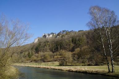 Keywords: russians castle blaubeuren swabian alb limestone rock rusenschloss ruin water running bach blue winter kahl forest trees outlook view