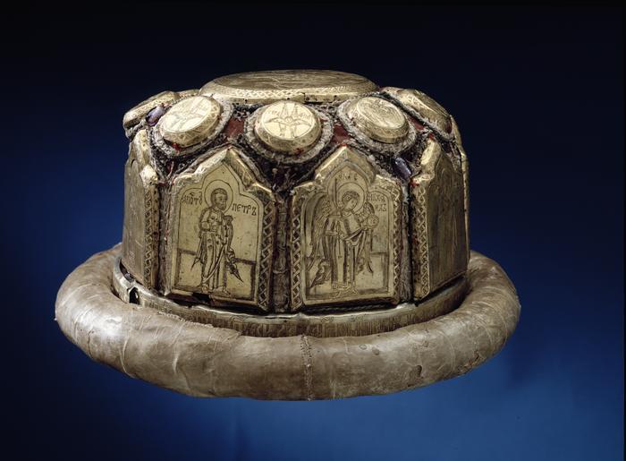 | Keywords: Rysk-ortodox mitra från 1650 - Livrustkammaren - 47481.tif LSH artwork sv Krigsbyge från Narva <br/>Mitra av hattformig modell med cylindrisk kulle med svagt rundad kant Vulstformigt brätte b ca 30 mm klätt med pergament ursprungligen med skinn Kullen klädd med delvis mycket slitet karminrött siden nertill vid brättet ring av förgylld silverplåt b 30 mm med graverad gammalslavisk text översättning se Bodin <br/>År 7 159 november 17 dagen gav statssekreteraren Michail Danilovs hustru änkan Uljana dotter till Vasilij denna biskopsmössa till Tjudovklostret till den undergörande Aleksijs hem till minne av sin make Michail Danilovitj eremitmunken Misail och sin dotter Ksenia för sin själ<br/>Därovanför en krans med sex ursprungligen nio helgonbilder graverade på rektangulära plåtar med trepassformig överdel mellersta bågen spetsig h 83 mm b 58 mm gammalslaviska texter <br/>1 - ett manligt helgon med otydlig text pete ; 2 - ärkeängeln Gabriel achange gabri ; 3 - Maria mrthy mätär Theo - Guds moder ; 4 - ärkeängeln Mikael achage michail ; 5 - evengelisten Petrus apoto petr ; 6 - helgon i biskopsdräkt st alekse miro <br/>På kullens översida en krans med nio runda plåtar med serafer och keruber fyra stycken med text serafim fem med cherubi <br/>Mitt på kullen en stor rund plåt d 102 5 mm med Maria och Jesusbarnet text mrthy Guds Moder <br/>Runt plåtarna broderier med silke silvertråd och -paljetter två ovala genomborrade glaspärlor bevarade <br/>Hatten invändigt stoppad och klädd med blekrött siden original caption Rysk-ortodox mitra från 1650 <br/> Nyckelord Liturgi Kristendom Religioner Huvudbonader Slaget vid Narva 1650 silver - silver - silk Färg röd karminröd material siden - parchment size mm 265 bräm g 6145 size mm 150 ca size mm 195 kulle LRK Karl XII av Sverige Mille ans de tradition chret 1988-1989 Kungens lockpipa 1995-1996 Karl XII och Peter den store Peter den store och Karl XII - i krig och fred 1998-1999 Livrustkammaren Krigsbyte 2007-2008 300-årsminnet av slaget vid Poltava / Poltava 300 Years Eremitaget och Kreml-museet 2009-2010 achange gabri Gabriel achage michail Mikael mrthy Mätär Theou - Guds Moder Maria apoto Petr S t Petrus Per st alekse miro S t Alexej Miro achange gabri Gabriel achage michail Mikael mrthy Mätär Theou - Guds Moder Maria apoto Petr S t Petrus Per st alekse miro S t Alexej Miro place of origin original filename lm_t05142 42045 inventory number LRK 5388 47481 CC-BY-SA <gallery caption Different images of same object > File Mitra Tchudov-klostret - Livrustkammaren - 38923 tif </gallery> Liturgy Headgear Religion Christianity Battle of Narva 1700 Media contributed by LSH dim-with multiple size templates Media contributed by LSH 2014-11 |