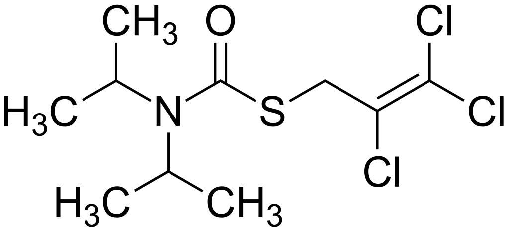 | Keywords: S-(2,3,3-trichloroallyl) diisopropylcarbamothioate 200.svg validSVG Structure of S- 2 3 3-trichloroallyl diisopropylcarbamothioate Own 2014-05-10 Emeldir <span class signature-talk >talk</span> Chemical structure verified https //upload wikimedia org/wikipedia/commons/e/ed/S- 282 2C3 2C3-trichloroallyl 29_diisopropylcarbamothioate_200 svg 1S/C10H16Cl3NOS/c1-6 2 14 7 3 4 10 15 16-5-8 11 9 12 13/h6-7H 5H2 1-4H3 MWBPRDONLNQCFV-UHFFFAOYSA-N 2303-17-5 Synonyms <small>2 3 3-trichloro-2-propene-1-thiol diisopropylcarbamate 2 3 3-Trichloro-2-propene-1-thiol diisopropylcarbamate 2 3 3-Trichloroallyl-N N-diisopropylthiolcarbamate Avadex BE Avadex BW Avadex BW R Bis 1-methylethyl carbamothioic acid S- 2 3 3-trichloro-2-propenyl ester CP 23426 Diisopropylthiocarbamic acid S- 2 3 3-trichloroallyl ester diisopropylthiocarbamic acid S- 2 3 3-trichloroallyl ester Far-Go Fargo R S- 2 3 3-trichloro-2-propenyl bis 1-methylethyl carbamothioate S- 2 3 3-Trichloro-2-propenyl bis 1-methylethyl carbamothioate S- 2 3 3-Trichloroallyl N N-diisopropylthiocarbamate S-2 3 3-trichloroallyl diisopropylthiocarbamate S-2 3 3-Trichloroallyl diisopropylthiocarbamate Triallate</small> PD-chem Thiocarbamates Herbicides Isopropyl compounds Alkene derivatives Organochlorides |