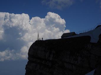 Keywords: säntis viewpoint clouds cumulus squall line threatening force of nature summit area view swiss alps appenzell alpstein alpstein region