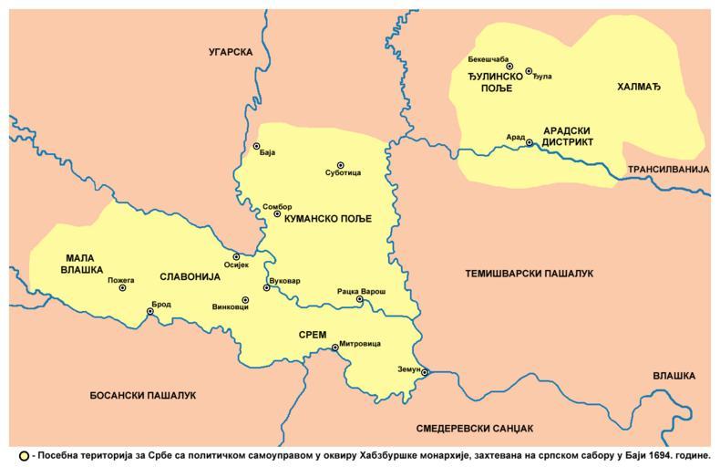 Keywords: Sabor u baji 1694 02.png en Separate territory for the Serbs with political autonomy within Habsburg Monarchy demanded at the Serb assembly in Baja in 1694 sr Посебна те ито ија за С бе са политичком самоуп авом у окви у Хабзбу шке мона хије захтевана на с пском сабо у у Баји 1694 године own PANONIAN 2014 Cc-zero References Čedomir Antić Dosije Autonomna Pokrajina Vojvodina Beograd 2014 Dimitrije Boarov Politička istorija Vojvodine Novi Sad 2001 J H Šviker Politička istorija Srba u Ugarskoj Novi Sad - Beograd 1998 Čedomir Popov - Jelena Popov Autonomija Vojvodine - srpsko pitanje Sremski Karlovci 2000 Dejan Mikavica Srpska Vojvodina u Habsburškoj monarhiji 1690-1920 Novi Sad 2005 Slavko Gavrilović O Srbima Habzburške monarhije Beograd 2010 Drago Njegovan Prisajedinjenje Vojvodine Srbiji Novi Sad 2004 Maps of the history of Bačka Maps of the history of Syrmia Maps of the history of Slavonia Maps of the history of Banat Maps of the history of Vojvodina Maps of the Ottoman period in the history of Serbia Maps of the Habsburg period in the history of Serbia Maps of proposed territories Maps in Serbian |