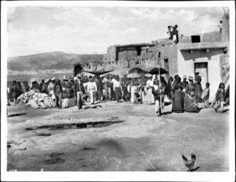 | Keywords: Sacred procession for the Fiesta de San Esteban (Saint Stephen), Acoma Pueblo, ca.1900 (CHS-4518).jpg en <br> Sacred procession for the Fiesta de San Esteban Saint Stephen Acoma Pueblo ca 1900 Photograph of the sacred procession for the Fiesta de San Esteban Saint Stephen Acoma Pueblo ca 1900 The crowd of more than a hundred can be seen at center walking in a procession The women wear long dresses while the men wear long-sleeved shirts and trousers Some of the women carry parasols The dirt road on which they walk has a slight depression filled with water to the left of center A rooster is visible walking across the road in the foreground The adobe buildings of the Pueblo are visible in the background at right A mountain range rises in the distance Call number CHS-4518 Photographer James George Wharton Filename CHS-4518 Coverage date circa 1900 Part of collection California Historical Society Collection 1860-1960 Type images Geographic subject city or populated place Acoma Pueblo Repository name USC Libraries Special Collections Accession number 4518 Microfiche number 1-160-19 Archival file chs_Volume96/CHS-4518 tiff Part of subcollection Title Insurance and Trust and C C Pierce Photography Collection 1860-1960 Repository address Doheny Memorial Library Los Angeles CA 90089-0189 Geographic subject country USA Format aacr2 2 photographs transparency photoprint b w ; 20 x 25 cm 17 x 22 cm Rights Digitally reproduced by the USC Digital Library; From the California Historical Society Collection at the University of Southern California Subject adlf tribal areas Project USC Repository email specol usc edu Identifying number unidentified no James-867 Contributing entity California Historical Society Date created circa 1900 Publisher of the digital version University of Southern California Libraries Format aat transparencies; photographic prints; photographs Geographic subject state New Mexico Legacy record ID chs-m16854; USC-1-1-1-13461 Access conditions Send requests to address or e-mail given Phone 213 821-2366; fax 213 740-2343 Subject file heading Indians -- Acoma Subject lcsh Indians of North America; Acoma Indians Subject Acoma Indians circa 1900 date created George Wharton James 1858 1923 http //digitallibrary usc edu/cdm/ref/collection/p15799coll65/id/16776 PD-old-70-1923 Images from USC Digital Library uploaded by Fæ Photographs by George Wharton James California Historical Society Collection 1860-1960 Acoma Pueblo |