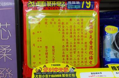 | Keywords: Sacrificial Writing for Ghost Festival on Package of Peacock Biscuit 20160724.jpg zh-tw 孔 餅乾包 上的慶讚中元普渡 禱文, 於統 超商鑫壽 市(146964) 2016-07-24 19 58 58 own 玄史生 other versions Ghost Festival in Taiwan Kuai Kuai Confectionery of Taiwan 玄史生写 文庫 Taken with Nikon Coolpix A cc-zero |