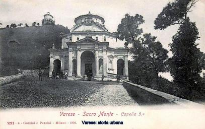 Keywords: La quinta cappella (la disputa coi dottori), in alto la dodicesima cappella (Ascensione) non ancora coperta dalla vegetazione boschiva, mette in mostra il porticato circolare. varese sacromonte