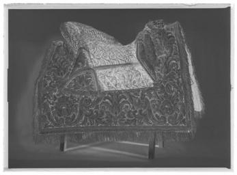 | Keywords: Sadel broderad i Frankrike och monterad i Sverige 1650 - Livrustkammaren - 10568-negative.tif LSH artwork Simon Jüterbock hovsadelmakare sv Sadel klädd med lila sammet med yttäckande broderi med guldtråd guldlan och pärlor i form av rankor palmetter och voluter Rektangulära kappor fodrade med mörkbrunt läder med bård av pärlor samt frans av tvinnad guldtråd Tvådelad frambom 475 mm bred 80 mm hög Bakbom med stödbommar 60 mm bred 115 mm hög Sitsen och bommarnas insidor klädda med lila sammet med parallella stickningar med guldtråd samt mellan dessa tunna rankor Sadelknapp rundad räfflad framåt utdragen av förgylld mässing samt blommor av målad emalj Två rader slipade folierade translucida stenar i guldfattning Framför frambommen 12 + 12 bakom bakbommen 12 + 12 tännlikor av förgylld mässing Bossor överklädda med naturfärgat linne kantat med ljusbrunt läder 4 stroppar för sadelgjord Två krampor för stigläder 2 söljor för förbygel av mässing Två krampor för hölster Tillbehör Svansrem överklädd med lila sammet ca 77 mm lång med lika yttäckande broderi hjärtformat smycke av förgylld mässing med emaljdekor i relief i form av blommor samt 22 stenar av varierande slipning Två konturerade spännen av förgylld mässing med emaljdekor Förbygel en ca 40 mm bred rem Använd av drottning Kristina vid hennes kröning 1650-10-20 och vid Karl X Gustavs kröning 1654-06-06 original caption Kristinas kröning Karl X Gustavs kröning - 1650 1654 brass s0 - sadlar material mässing - pearl s0 - sadlar material pärla - velvet Färg purpur s0 - sadlar material sammet size mm 250 sits size mm 640 LRK Kristina av Sverige Trofast - hov och tass i kunglig tjänst 2010-2011 Livrustkammaren Trogna vänner - Kungliga hästar och hundar 2011-2012 Museiverket/Finlands nationalmuseum Bilder av Kristina 2013-2014 Livrustkammaren Livrustkammaren nya basutställning 2018 LRK bas 2018 Livrustkammaren place of origin SE Monterad FR Broderad original filename LN_B17211_020091 45560 inventory number LRK 9025 10568 CC0 Sadel broderad i Frankrike och monterad i Sverige 1650 - Livrustkammaren - 10568 tif <gallery caption Different images of same object > File Kröningssadel guld pärlor Drottning Kristina - Livrustkammaren - 86619 tif File Kröningssadel och schabrak använt av Kristina och Karl X Gustav - Livrustkammaren - 91422 tif File Sadel broderad i Frankrike monterad i Sverige 1650 - Livrustkammaren - 10093 tif File Sadel broderad i Frankrike monterad i Sverige 1650 - Livrustkammaren - 77578 tif File Sadel broderad i Frankrike och monterad i Sverige 1650 - Livrustkammaren - 2728 tif File Sadel broderad i Frankrike monterad i Sverige 1650 - Livrustkammaren - 27217 tif File Sadel broderad i Frankrike och monterad i Sverige 1650 - Livrustkammaren - 70494 tif File Sadel broderad i Frankrike och monterad i Sverige 1650 - Livrustkammaren - 2008 tif File Detalj knytband schabrak - Livrustkammaren - 71224 tif File Detalj av kröningssadel Drottning Kristina - Livrustkammaren - 86622 tif File Sadel broderad i Frankrike och monterad i Sverige 1650 - Livrustkammaren - 79053 tif File Sadel broderad i Frankrike och monterad i Sverige 1650 - Livrustkammaren - 19130 tif File Sadel broderad i Frankrike och monterad i Sverige 1650 - Livrustkammaren - 60434 tif </gallery> <gallery caption Related objects > File Hjullåspistol Nederländerna ca 1640-1650 beslagen av Jürgen Dargeman Stockholm 1650 - Livrustkammaren - 27999 tif LRK 4723 File Stigbygel - Livrustkammaren - 42841 tif LRK 9028 File Detalj av schabrak Kröningssadel Drottning Kristina - Livrustkammaren - 86625 tif LRK 9032 File Dargeman stångbett - Livrustkammaren - 8607 tif LRK 6224 File Remmar - Livrustkammaren - 19883 tif LRK 6225 File Pistolhölster till kröningssadel 9025 - Livrustkammaren - 44825 tif LRK 9026 File Stångbett av förgyllt stål med bladrankor av guldplåt med blommor av emalj 1650 - Livrustkammaren - 108091 tif LRK 6224 File Hjullåspistol Nederländerna ca 1640-1650 beslagen av Jürgen Dargeman Stockholm 1650 - Livrustkammaren - 69399 tif LRK 4722 File Remmar - Livrustkammaren - 37006 tif LRK 6225 File Pistolhölster till kröningssadel 9025 - Livrustkammaren - 53386 tif LRK 9026 File Förbygelsmycke Kröningsadel Drottning Kristina - Livrustkammaren - 86644 tif LRK 6226 File Pistolhölster till kröningssadel 9025 - Livrustkammaren - 62659 tif LRK 9026 File Huvudlag - Livrustkammaren - 52903 tif LRK 9030 File Förbygelsmycke - Livrustkammaren - 60285 tif LRK 6226 File Stångbett med skänklar Del av huvudlag Kröningssadel Drottning Kristina - Livrustkammaren - 86654 tif LRK 6224 File Huvudlag - Livrustkammaren - 44342 tif LRK 9030 File Dargeman stångbett - Livrustkammaren - 17169 tif LRK 6224 File Hjullåspistol Nederländerna ca 1640-1650 beslagen av Jürgen Dargeman Stockholm 1650 - Livrustkammaren - 53679 tif LRK 4722 File Sits till sadeltäcke - Livrustkammaren - 35919 tif LRK 9035 File Stångbett 1650 - Livrustkammaren - 108090 tif LRK 6224 File Hjullåspistol Nederländerna ca 1640-1650 beslagen av Jürgen Dargeman Stockholm 1650 - Livrustkammaren - 45118 tif LRK 4723 File Guld- och pärlbroderat huvudlag 1650 - Livrustkammaren - 100935 tif LRK 9030 File Hjullåspistol Nederländerna ca 1640-1650 beslagen av Jürgen Dargeman Stockholm 1650 - Livrustkammaren - 36560 tif LRK 4723 File Pistolhölster 1650 - Livrustkammaren - 43163 tif LRK 9026 File Remmar - Livrustkammaren - 28445 tif LRK 6225 File Sits till sadeltäcke - Livrustkammaren - 27358 tif LRK 9035 </gallery> |