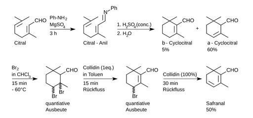 | Keywords: Safranal synthesis.svg Synthesis of Safranal starting from Citral <br> according to W M B Könst L M van der Linde and H Boelens Tetrahedron Letters 15 36 1974 pp 3175-3178 Own 2009-06-28 Joël Gubler alias Talos public domain Organic syntheses |
