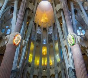 Keywords: sagrada familia cathedral barcelona spain stained glass window ceiling architecture church famous religion gothic building inside old medieval landmark ancient tourism city religious
