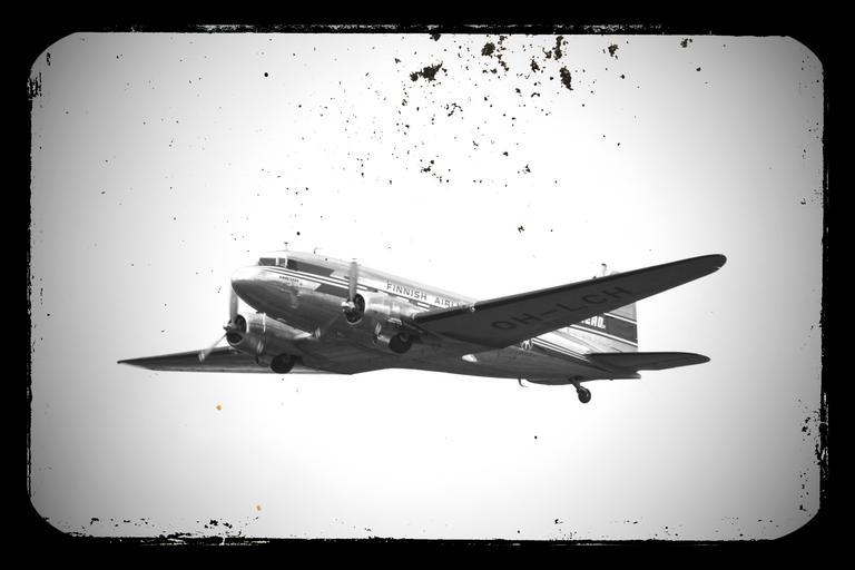 | Keywords: aero oy aerooy dc-3 dc3 www.dc-ry.fi wwwdcryfi helsinki air show helsinkiairshow oh-lch ohlch photo border blackandwhite black and white Having looked at some real vintage photographs today, I thought I'd upload this little bit of fun that I hacked up with a dirty viewfinder shot that I picked up on Flickr. This glorious Silver Bird is of course the iconic DC-3 that pretty much defined the civilian aviation industry as we know it today. It's hard to overstate the importance of this magnificent little airliner. This absolutely stunning example is in the sky thanks to the efforts of the DC Association in Finland, and she flies in the Aero OY livery that became Finnair in the fullness of time. I'm honoured to have seen her in the flesh - she really is a graceful aircraft and she sounds beautiful. I took this shot at the Helsinki Air Show last summer. Having looked at some real vintage photographs today, I thought I'd upload this little bit of fun that I hacked up with a dirty viewfinder shot that I picked up on Flickr. This glorious Silver Bird is of course the iconic DC-3 that pretty much defined the civilian aviation industry as we know it today. It's hard to overstate the importance of this magnificent little airliner. This absolutely stunning example is in the sky thanks to the efforts of the DC Association in Finland, and she flies in the Aero OY livery that became Finnair in the fullness of time. I'm honoured to have seen her in the flesh - she really is a graceful aircraft and she sounds beautiful. I took this shot at the Helsinki Air Show last summer. |