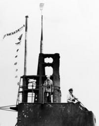 | Keywords: Sail of USS Wahoo (SS-238) at Pearl Harbor with broom, in February 1943.jpg The U S Navy submarine USS Wahoo SS-238 at Pearl Harbor Hawaii USA soon after the end of her third war patrol circa 7 February 1943 Her Commanding Officer Lieutenant Commander Dudley W Morton is on the open bridge in right center <br> Note the broom lashed to the periscope head indicating a clean sweep of enemy targets encountered; the pennant bearing the slogan Shoot the sunza bitches and eight small flags representing claimed sinkings of two Japanese warships and six merchant vessels Note that the forward radar mast mounted in front of the periscope shears has been censored out of this photograph Official U S Navy photo https //www history navy mil/our-collections/photography/numerical-list-of-images/nara-series/80-g/80-G-30000/80-G-35726 html 80-G-35726 cropped from the U S Navy http //www history navy mil Naval History and Heritage Command ca 1943-02-07 U S Navy PD-USGov-Military-Navy Original upload log page en wikipedia WahooBroom jpg 2006-10-30 22 24 The Epopt 343×427× 17876 bytes Cropped from the public domain image http //www history navy mil/photos/images/g30000/g35726 jpg USS Wahoo SS-238 Pearl Harbor in World War II Pacific War in February 1943 Dudley Morton |