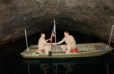 | Keywords: Sailor re-enlists 2,000 feet underground 090515-N-DB216-008.jpg en Chief Yeoman Robert Lewis re-enlists aboard a temporary Navy ship 2 000 feet underground in one of four Cheyenne Mountain Air Force Station's 1 5 million gallon water reservoirs on May 15 2009 with Navy Capt Stephen Lurch Thompson director of the Cheyenne Mountain Division serving as the presiding officer CMAFS located 7 200 feet above sea level in Colorado Springs Colo is an unusual assignment location for Navy personnel and even more rare is that there are four water reservoirs inside the complex built in the 1960s and still serving today The reservoirs store water that bubbles from a natural spring located underneath the 15-building complex which today is operated and maintained by the United States Air Force Space Command For Navy personnel assigned at CMAFS located 1 500 miles from the nearest ocean the water reservoirs serve as the best place to re-enlist and observe the finest traditions of the naval service while serving in Colorado Springs 2009-05-15 U S Navy photo by Mass Communication Specialist 1st Class John James Mason/Released https //www dvidshub net/image/1269877 090515-N-DB216-008 2014-04-24 08 08 COLORADO SPRINGS CO US PD-USGov-Military-Navy Cheyene Mountain Air Force Station Images from DoD uploaded by Fæ |