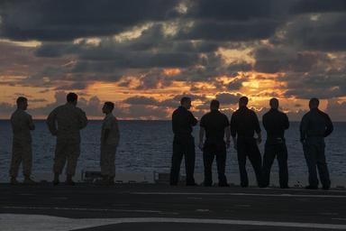 Keywords: sailors aircraft carrier navy military ship sunset sundown silhouette ocean sea nautical service at sea