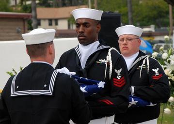 | Keywords: Sailors honor deceased submarine veteran DVIDS99684.jpg en Petty Officer 1st Class Antonio Shelly left and Petty Officer 2nd Class Seth Gibson prepare to present the ceremonial flag to the children of retired Cmdr Joseph L McGrievy during a memorial service held at Naval Base Point Loma Cmdr McGrievy was a recipient of the Silver Star and a 30-year submarine veteran who made 11 successful war patrols during World War II 2008-03-12 Chief Petty Officer Yan Kennon https //www dvidshub net/image/99684 080312-N-+++++-200 2008-07-02 21 32 SAN DIEGO CA US PD-USGov-Military-Navy Naval Base Point Loma Images from DoD uploaded by Fæ |