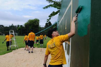 | Keywords: Sailors and Marines play football with children in Thailand 110504-N-IC111-517.jpg en Sailors and Marines assigned to the aircraft carrier USS Ronald Reagan paint the Youth Football Home practice walls during a community service project Ronald Reagan is currently anchored in Makham Bay Thailand for a scheduled port visit Photo by Petty Officer 3rd Class Kevin B Gray 2011-05-04 Kevin Gray https //www dvidshub net/image/397705 110504-N-IC111-517 2011-05-05 01 04 THALANG PHUKET TH PD-USGov-Military-Navy USS Ronald Reagan CVN-76 Images from DoD uploaded by Fæ |