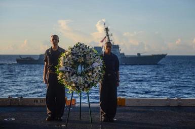 | Keywords: Sailors stand at attention during a wreath-laying ceremony on USS John C. Stennis. (27499952385).jpg SOUTH CHINA SEA June 4 2016 Chief Religious Program Specialist Paul Drachenberg and Aviation Ordnanceman Airman Crystal Randle stand at attention during a wreath-laying ceremony on USS John C Stennis' CVN 74 aircraft elevator in honor of the 74th anniversary of the Battle of Midway as the guided-missile destroyer USS Chung-Hoon DDG 93 steams alongside The Battle of Midway was a key naval battle between the forces of the United States and the Empire of Japan that is considered the turning point in the Pacific theater of operations during World War II Providing a ready force supporting security and stability in the Indo-Asia-Pacific John C Stennis is operating as part of the Great Green Fleet on a regularly scheduled 7th Fleet deployment U S Navy photo by Mass Communication Specialist 3rd Class David Cox/Released 160604-N-KM939-0047 Join the conversation http //www navy mil/viewGallery asp www navy mil/viewGallery asp http //www facebook com/USNavy www facebook com/USNavy http //www twitter com/USNavy www twitter com/USNavy http //navylive dodlive mil navylive dodlive mil http //pinterest com pinterest com https //plus google com plus google com https //www flickr com/photos/usnavy/27499952385/ Sailors stand at attention during a wreath-laying ceremony on USS John C Stennis 2016-06-04 10 15 https //www flickr com/people/56594044 N06 Official U S Navy Page from United States of America MC3 David Cox/U S Navy Attribution License IPTC Caption-Abstract U S Navy photo PD-USGov-Military-Navy Official U S Navy Imagery https //flickr com/photos/56594044 N06/27499952385 2016-06-06 19 50 46 cc-by-2 0 160604-N-KM939-0047 Navy Photographs taken on 2016-06-04 Taken with Nikon D4 USS Chung-Hoon DDG-93 USS John C Stennis CVN-74 flight deck Wreath laying ceremonies Files from the U S Navy Flickr stream |