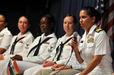 | Keywords: Sailors visit India DVIDS380349.jpg en Cmdr Shanti Sethi commanding officer of the Arleigh Burke-class guided-missile destroyer USS Decatur answers question from female students from various city colleges and high schools to commemorate Women's History Month Sethi brought along eight female sailors from Decatur to participate in the interaction with the students in Chennai India Decatur's port visit to Chennai is part of a routine deployment conducting maritime security operations in the 7th Fleet area of responsibility 2011-03-17 Petty Officer 1st Class Jennifer Villalovos https //www dvidshub net/image/380349 110317-N-+++++-445 2011-03-21 17 45 CHENNAI IN PD-USGov-Military-Navy Women's History Month Images from DoD uploaded by Fæ |