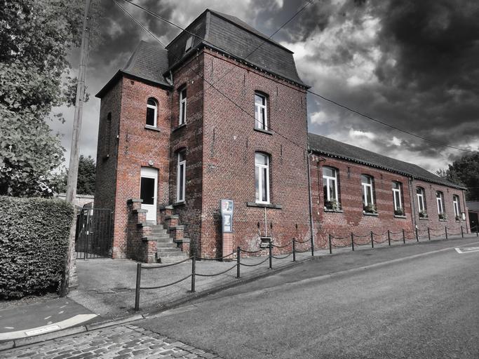 Keywords: sains du nord france school building architecture brick sky clouds isolated color black and white street outside town