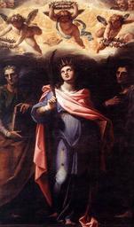 | Keywords: Saints Domitilla, Nereus and Achilleus.jpg Artwork Creator Cristoforo Roncalli ca 1598 1599 Oil on canvas size cm 277 166 Institution Chiesa dei Santi Nereo e Achilleo Rome cite book Pupillo Marco Caravaggio's Rome 1600-1630 2012 Skira Editore S p A Milan 9788857213873 48-49 http //books google co za/books id UtCBtgAACAAJ Rossella Vodret The Alternative to Caravaggio Artists from Tuscany Bologna and Elsewhere Public Works object history Commissioned by cardinal Cesare Baronio for the left altar of the church of Santi Nereo e Achilleo consecrated on 15 February 1599 credit line accession number WGA link 18062 http //www wga hu/art/p/pomaranc/domitill jpg http //www wga hu/html/p/pomaranc/domitill html PD-old-100 painting religious Italian 1551-1600 Cristoforo Roncalli Domitilla with Sts Nereus and Achilleus Ancient Roman saints Christian martyrs of the Roman era Santi Nereo e Achilleo Rome - Interior 16th-century religious paintings in Italy 1590s paintings in Italy 1590s paintings from Italy 16th-century paintings of Christian saints WGA form painting WGA type religious WGA School Italian WGA time period 1551-1600 Paintings of putti in Rome Blue and red clothing in art Flavian dynasty |