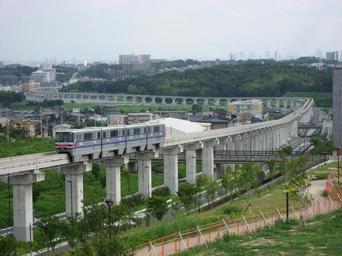 Keywords: Saito Line.jpg en A train approaches to Saito Nishi station ja 豊 -彩都西間を走行する列車 Own もんじゃ 2011-07-25 Osaka Monorail Saito Line Ibaraki Osaka