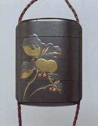 | Keywords: Sakai Hoitsu - Inro with Pine and Snow-Covered Ardisia Japonica - Walters 67415 - View A.jpg A standard oblong grey lacquer three case inro On one side a snow-covered yabukoji in hiramakie in gold with berries in applied carnelain on a grey lacquer round On the other side a pine branch with a pine cone in gold Inscribed in gold near the pine tree and a red seal Inscribed on the bottom of the lower case with the inro artist's name The interior of red lacquer and fundame The cord channels are external Together with a carved ivory netsuke seal of a shishi on a ball all on a rectangular platform late Other date century 18 Edo lacquer carnelian inlay gold ivory inro cm 7 4 5 6 2 2 accession number 67 415 22782 William T / Henry Walters Collection Baltimore date and mode of acquisition unknown Walters Art Museum Henry Walters Acquired by William T or Henry Walters Designer Hoitsu hitsu; Seal Keikyo; Signature Yoyusai; Translation After the design of Hoitsu place of origin Edo present-day Tokyo Japan Walters Art Museum license Inro in the Walters Art Museum Sakai Hoitsu Hara Yoyusai Ardisia japonica |