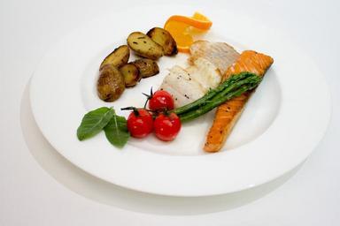 Keywords: salmon grilled eat plate white porcelain tableware lunch delicious