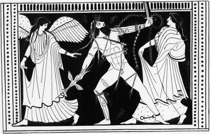 | Keywords: Salmoneus AJA 1899.jpg Salmoneus wielding a sword and a thunderbolt-like thingy He just broke the chains that contained him the madman and acts like Zeus To his left is Iris to the right his astonished wife Attic red-figure column crater first half of the 5th century BC Now in the Chicago Art Institute 1889 16 This painting was first published by Ernest Arthur Gardner 1899 and attributed as Athamas in madness In 1903 Carl Robert corrected this interpretation to Salmoneus American Journal of Archaeology vol 3 1899 p 332 pl IV 1899 photo anonymous PD-old Salmoneus in ancient Greek pottery Column kraters Attic red-figure pottery 5th-century BC pottery Iris mythology Mental disorders in art |