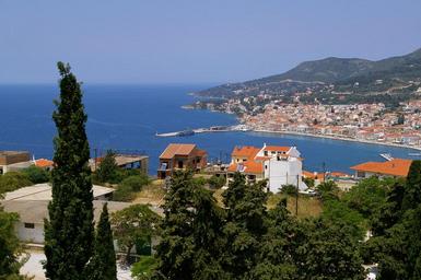 Keywords: samos island greece holiday sea beach water clouds landscape outlook panorama summer tourism blue sky blue sky view mountains nature port coast mediterranean azure village place