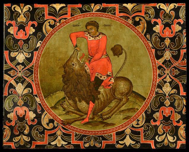 Keywords: Samson Fighting the Lion (18th c., Kargopol style).jpg Samson Fighting the Lion Within a medallion Samson is represented against an olive green background wrestling the lion and tearing open the mouth with his bare hands The scene is surrounded with decorative floral ornamentation executed in bright colours Samson and the Lion is a very rare subject in Russian icon painting This early example comes from the row with old testament scenes situated below the local row of an iconostasis The style of the painting points towards an origin from the Kargopol region http //www morsink com/russian-icons/a-rare-icon-of-samson-fighting-the-lion-f-24 First half 18th century Russia Kargopol Region RusIcon PD-RusEmpire PD-Art PD-old-auto Files uploaded by Shakko from various sources Private collections of Russian art 18th-century icons of Russia Samson Icons of Old Testament figures Kargopol |