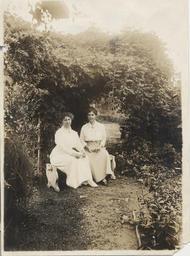 Keywords: Sallie Lee Lightfoot & Lala Long seated on bench under rose arbor, c. 1915