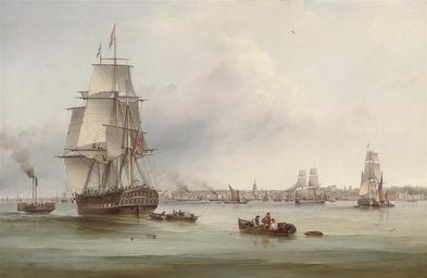 | Keywords: Samuel Walters - The three-masted merchantman „Thames“ under tow off Gravesend.jpg Artwork Creator Samuel Walters The Thames of 454 tons was built in London in 1829 for the West India trade Originally owned by Hibberts of London she later passed into the ownership of Thompson of London and was in service for over thirty years 1839 oil canvas cm 50 76 2 object history credit line indistinctly signed and dated '1839' lower right Gravesend can be identified by the spire of St George's church the Royal Terrace Pier the two windmills on Windmill Hill and on the right Roshville with its formal ornamental gardens accession number christies online 5259466 5949 42 London 11 November 2009 PD-old-100 Samuel Walters 1839 paintings 1839 in England 19th-century sailing ships in paintings Thames ship 1829 Gravesend |