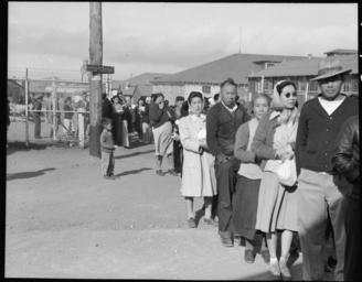 Keywords: San Bruno, California. Supper time^ Meal times are the big events of the day within an assembly ce . . . - NARA - 537932.jpg Scope and content The full caption for this photograph reads San Bruno California Supper time Meal times are the big events of the day within an assembly center This is a line-up of evacuees waiting for the B shift at 5 45 pm They carry with them their own dishes and cutlery in bags to protect them from the dust They themselves individually wash their own dishes after each meal since dish washing facilities in the mess halls proved inadequate Most of the residents prefer this second shift because they sometimes get second helpings but the groups are rotated each week There are eighteen mess halls in camp which together accomodate 8 000 persons three times a day All food is prepared and served by evacuees General notes 537932 Local identifier 210-G-C632 Department of the Interior War Relocation Authority 02/16/1944 - 06/30/1946 NARA-Author Lange Dorothea 1895-1965 Photographer 1372774 <br /> Still Picture Records Section Special Media Archives Services Division NWCS-S National Archives at College Park 8601 Adelphi Road College Park MD 20740-6001 1942-06-16 Record group Record Group 210 Records of the War Relocation Authority 1941 - 1989 Record group ARC 537 Central Photographic File of the War Relocation Authority compiled 1942 - 1945 Series ARC 536000 File unit File unit ARC Variant control numbers NAIL Control Number NWDNS-210-G-C632 Other versions <gallery> File San_Bruno _California _Supper_time _Meal_times_are_the_big_events_of_the_day_within_an_assembly_ce_ _ _ _-_NARA_-_537932 tif tif File San_Bruno _California _Supper_time _Meal_times_are_the_big_events_of_the_day_within_an_assembly_ce_ _ _ _-_NARA_-_537932 jpg jpg </gallery> NARA-cooperation PD-USGov Dorothea Lange Tanforan Assembly Center