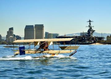 Keywords: san diego california airplane plane aircraft ship classic nostalgia bay harbor water buildings sky clouds