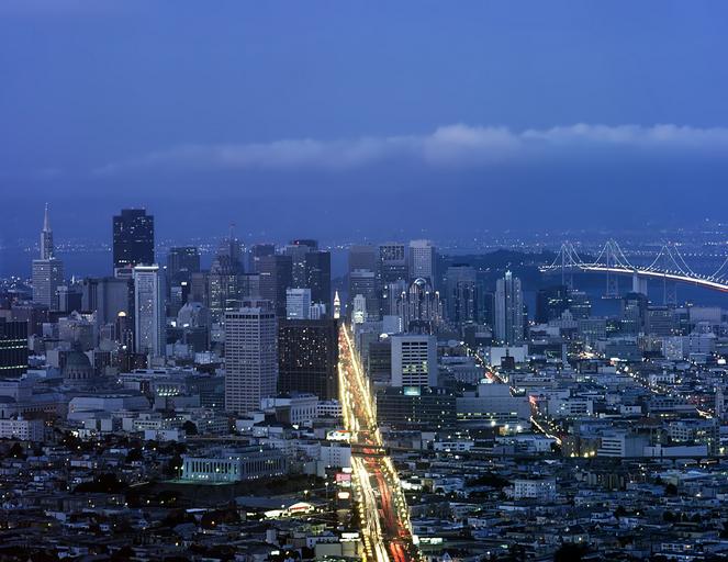 Keywords: san francisco california city cities urban skyline buildings architecture skyscrapers cityscape downtown sky clouds bay harbor water outside night evening dusk lights traffic road street highway