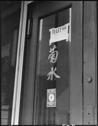 | Keywords: San Francisco, California. Entrance to a restaurant vacated by a proprietor of Japanese descent pri . . . - NARA - 536020.jpg Scope and content The full caption for this photograph reads San Francisco California Entrance to a restaurant vacated by a proprietor of Japanese descent prior to evacuation Evacuees of Japanese ancestry will be housed in War Relocation Authority centers where they will spend the duration General notes 536020 Local identifier 210-G-A42 Department of the Interior War Relocation Authority 02/16/1944 - 06/30/1946 NARA-Author Lange Dorothea 1895-1965 Photographer 1372774 <br /> Still Picture Records Section Special Media Archives Services Division NWCS-S National Archives at College Park 8601 Adelphi Road College Park MD 20740-6001 1942-04-13 Record group Record Group 210 Records of the War Relocation Authority 1941 - 1989 Record group ARC 537 Central Photographic File of the War Relocation Authority compiled 1942 - 1945 Series ARC 536000 File unit File unit ARC Variant control numbers NAIL Control Number NWDNS-210-G-A42 Other versions <gallery> File San_Francisco _California _Entrance_to_a_restaurant_vacated_by_a_proprietor_of_Japanese_descent_pri_ _ _ _-_NARA_-_536020 tif tif File San_Francisco _California _Entrance_to_a_restaurant_vacated_by_a_proprietor_of_Japanese_descent_pri_ _ _ _-_NARA_-_536020 jpg jpg </gallery> NARA-cooperation PD-USGov Japanese style restaurants in California Dorothea Lange Community Chest |
