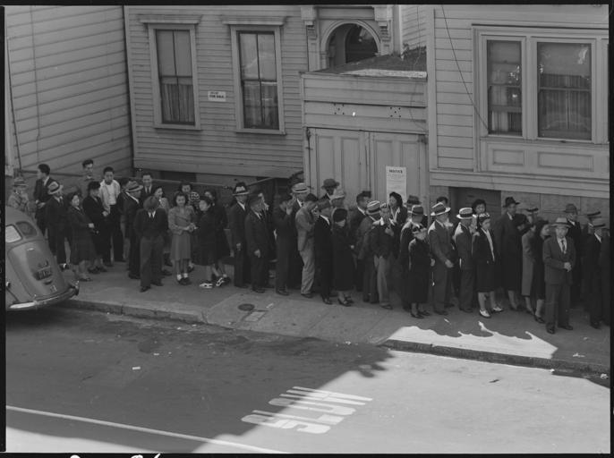 | Keywords: San Francisco, California. Heads of families and single persons living alone, of Japanese ancestry, . . . - NARA - 537526.jpg Scope and content The full caption for this photograph reads San Francisco California Heads of families and single persons living alone of Japanese ancestry in response to Civilian Exclusion Order Number 20 line up on Bush Street for half a block at the Wartime Civil Control Administration Control Station to receive their final instructions concerning their evacuation The evacuation of this district will be completed in five days from the time this photograph was made Note Exclusion Order posted on garage door; also House for Sale sign These evacuees and others of Japanese descent will spend the duration at War Relocation Authority centers General notes 537526 Local identifier 210-G-C176 Department of the Interior War Relocation Authority 02/16/1944 - 06/30/1946 NARA-Author Lange Dorothea 1895-1965 Photographer 1372774 <br /> Still Picture Records Section Special Media Archives Services Division NWCS-S National Archives at College Park 8601 Adelphi Road College Park MD 20740-6001 1942-04-25 Record group Record Group 210 Records of the War Relocation Authority 1941 - 1989 Record group ARC 537 Central Photographic File of the War Relocation Authority compiled 1942 - 1945 Series ARC 536000 File unit File unit ARC Variant control numbers NAIL Control Number NWDNS-210-G-C176 Other versions <gallery> File San_Francisco _California _Heads_of_families_and_single_persons_living_alone _of_Japanese_ancestry _ _ _ _-_NARA_-_537526 tif tif File San_Francisco _California _Heads_of_families_and_single_persons_living_alone _of_Japanese_ancestry _ _ _ _-_NARA_-_537526 jpg jpg </gallery> NARA-cooperation PD-USGov Dorothea Lange Japanese American internment processing in San Francisco |