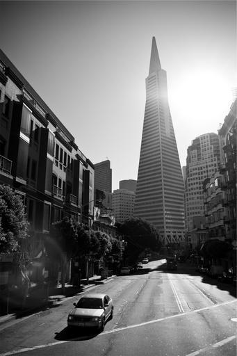 Keywords: san francisco city buildings architecture streets roads cars towers skyscrapers black and white