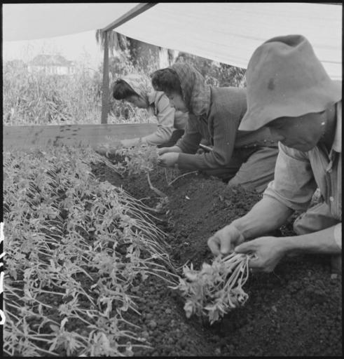 | Keywords: San Leandro, California. Family labor transplanting young tomato plants under canvas about ten days . . . - NARA - 536436.jpg Scope and content The full caption for this photograph reads San Leandro California Family labor transplanting young tomato plants under canvas about ten days prior to evacuation of residents of Japanese ancestry to Assembly Centers General notes 536436 Local identifier 210-G-A545 Department of the Interior War Relocation Authority 02/16/1944 - 06/30/1946 NARA-Author Lange Dorothea 1895-1965 Photographer 1372774 <br /> Still Picture Records Section Special Media Archives Services Division NWCS-S National Archives at College Park 8601 Adelphi Road College Park MD 20740-6001 1942-04-26 Record group Record Group 210 Records of the War Relocation Authority 1941 - 1989 Record group ARC 537 Central Photographic File of the War Relocation Authority compiled 1942 - 1945 Series ARC 536000 File unit File unit ARC Variant control numbers NAIL Control Number NWDNS-210-G-A545 Other versions <gallery> File San_Leandro _California _Family_labor_transplanting_young_tomato_plants_under_canvas_about_ten_days_ _ _ _-_NARA_-_536436 tif tif File San_Leandro _California _Family_labor_transplanting_young_tomato_plants_under_canvas_about_ten_days_ _ _ _-_NARA_-_536436 jpg jpg </gallery> NARA-cooperation PD-USGov Japanese American internment processing in San Leandro California Agriculture in California Women at work in California Men at work in California Greenhouses in the United States Dorothea Lange Black and white photographs of women |