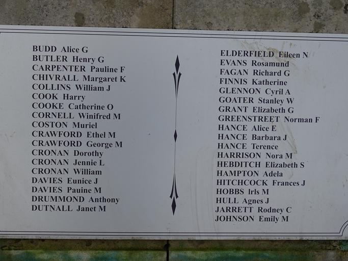 | Keywords: text document outdoor plaque writing sign The Sandhurst Road School Disaster was an air raid on a school in Minard Road, Catford, south east London on Wednesday, 20 January, 1943. A German fighter-bomber dropped a 500 kg (1,100 lb) bomb on the school at 12.30 pm, killing 32 children and six staff and injuring another 60 people. Many were buried for hours under the rubble, and six more children died in hospital. The Sandhurst Road School Disaster was an air raid on a school in Minard Road, Catford, south east London on Wednesday, 20 January, 1943. A German fighter-bomber dropped a 500 kg (1,100 lb) bomb on the school at 12.30 pm, killing 32 children and six staff and injuring another 60 people. Many were buried for hours under the rubble, and six more children died in hospital. |