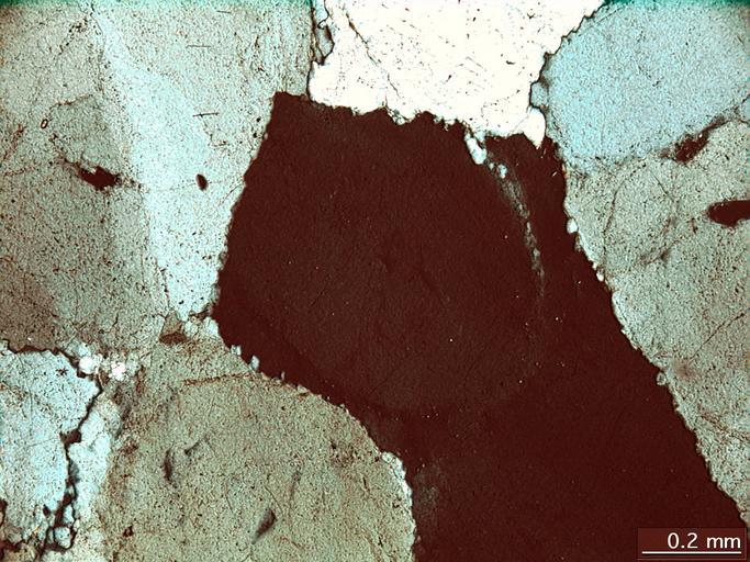 Keywords: Sandstone homoaxial cement.jpg Thin section of the Weverton quartzite/sandstone Cambrian of Maryland USA cross polarized light All crystals are of the mineral quartz The original rounded shape of the detrital grains is preserved in fluid inclusion patterns A homoaxial cement of quartz grew into the pores untill the whol rock was cemented Own 2007-12 Woudloper Sandstone in thin section |