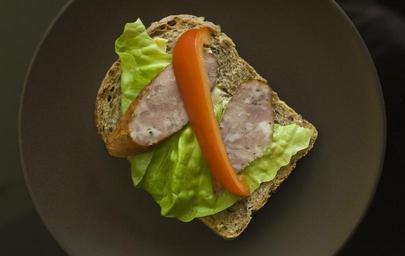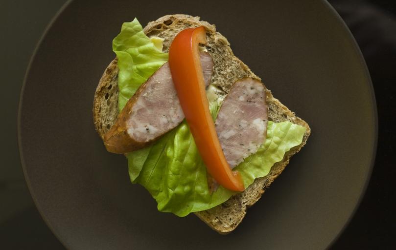 Keywords: sandwich sausage salad pepper vegetables plate bread food breakfast snack meal lettuce fresh slice healthy homemade