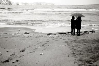 Keywords: sandy children boy girls share an umbrella winter sea footprints umbrella