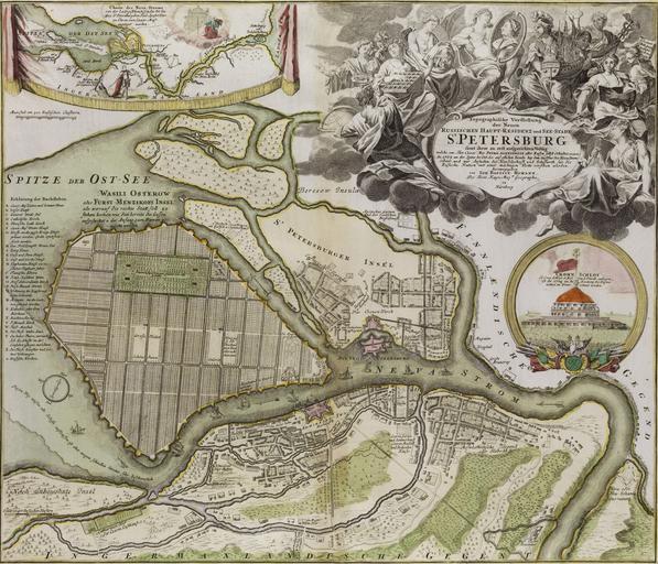 Keywords: Sankt Petersburg 1719-1723.jpg Sankt Petersburg 1719-1723 Kolorierter Kupferstich und Radierung Topographische Vorstellung der Neuen Hauptresidenz und See-Stadt St Petersburg samt ihrer zu erst aufgerichteten Vestung http //www hampel-auctions com/ Hampel Auctions between 1719 1723 Johann Baptist Homann 1664-1724 PD-old-100 Images from Hampel Auctions Homann map St Petersburg ab1720 |