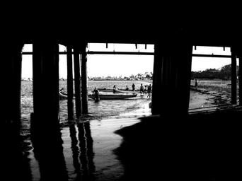 Keywords: santa monica pier california rowing team beach pacific ocean water ocean pacific sand nature shoreline surf waves pilings rowboat shadow