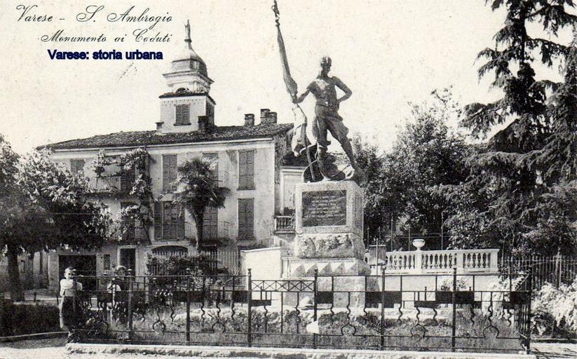 Keywords: Piazza Milite Ignoto: al centro della piazza il vecchio monumento ai caduti (opera di Ernesto Bazzaro), asportato dalle truppe tedesche nel 1944 e sostituito nel 1957 dalla statua di Angelo Frattini. A sinistra il campanile della vecchia chiesa di Sant'Ambrogio. varese sambrogioolona