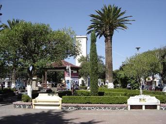 Keywords: SantiagoTpec01.JPG 20 02 21 N 98 21 24 W Jardin del Centro de Santiago Tulantepec al fondo se Observa el Reloj Own 2006-04-25 Gerardo Perea Nieto public domain Santiago Tulantepec Plazas in Hidalgo Clock towers in Hidalgo