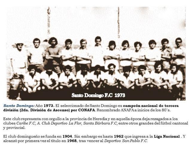 | Keywords: SANTO DOMINGO DE HEREDIA OSTENTA SU TERCER CAMPEONATO EN 1973.jpg Santo Domingo F C es Santo Domingo tuvo como antecedentes a la A D Domingueña anteriormente Club Sport Domingueño equipo que militaba en los torneos cantonales en 1904 Los ciudadanos domingueños se interesaron por constituir un equipo que representara a Santo Domingo y que compitiera en la terceras y segundas divisiones de ascenso El 20 de septiembre de 1904 se funda el Club Sport Domingueño constituyendose la primera Junta Directiva integrada por su presidente don Eulogio Aguilar B Para la década de los 50`s se utiliza de base al Atlético Santa Rosa F C y Deportivo Danubio F C para competir en los torneos de canchas abiertas e interdistritales por Heredia es En los años 1949-50 los domingueños son campeones del torneo intercantonal de barrios o distritos por Heredia Primero le ganan a Santa Bárbara y luego a la Selección de San Pablo El club azul se alista para militar en la tercera división pero no le alcanza Vuelve a la carga y allí la selección domingueña Santo Domingo F C se consolida como club de fútbol costarricense siendo subcampeón en 1964 Y cuatro años después ostenta el título de Liga Nacional 1968 y de Tercera División 2da División de Ascenso en 1970-1973 own Fútbol Herediano 2013-01-25 Santo Domingo retorna a la liga federada 2006-2007 de 2da División de ANAFA cuarta división En la temporada 2009-2010 los domingueños logran su ascenso a la Primera División de LINAFA Y donde se encuentran compitiendo actualmente con un excelente rendimiento Cc-zero Group photographs of association football teams in Costa Rica Santo Domingo Heredia |
