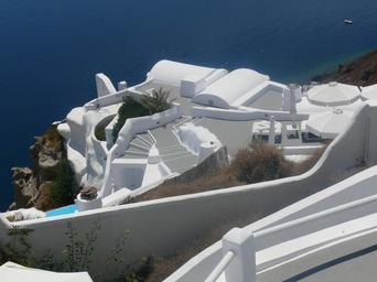 Keywords: santorini caldera blue island volcano greece sea travel mediterranean color holiday white oia light building architecture sea front apartment terrace terrace