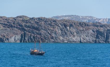 Keywords: santorini pirate ship mountains water scenery boat ocean vessel travel